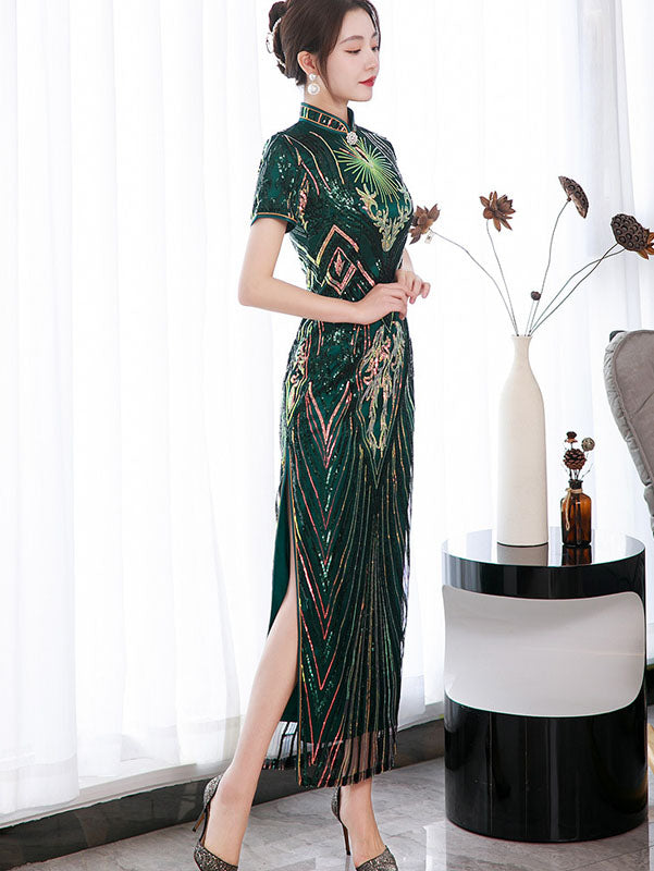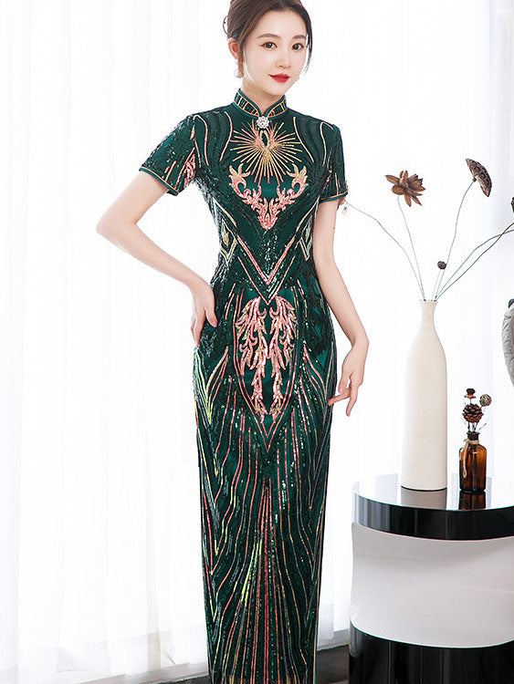 Green Sequined Velvet Full Qi Pao Cheongsam Dress