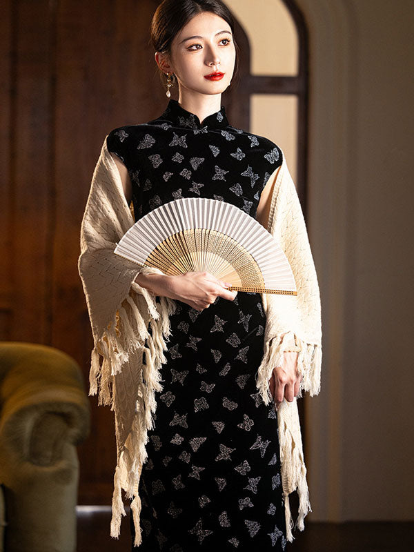 Black Shimmery Butterfly Velvet Cheongsam Qipao Dress