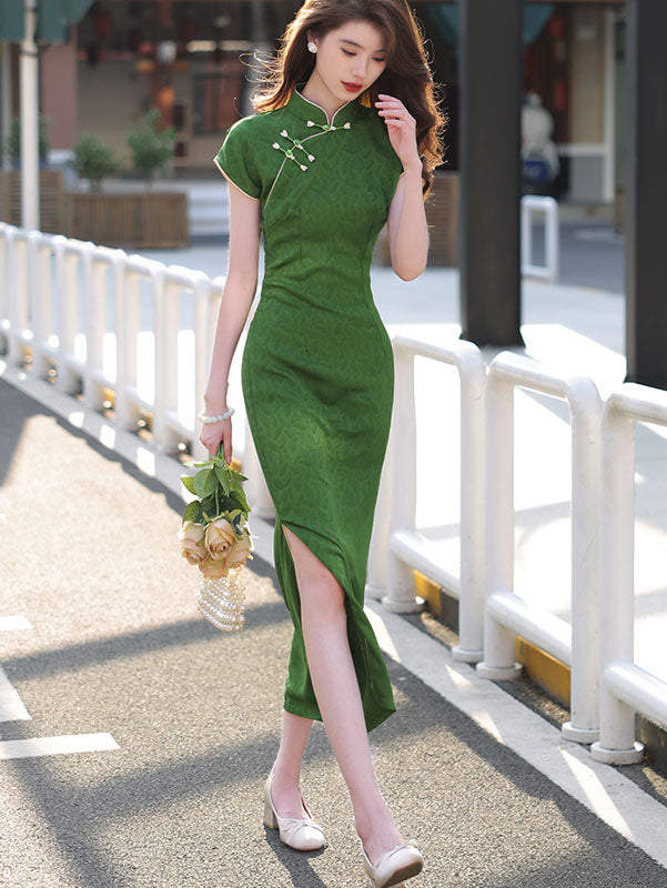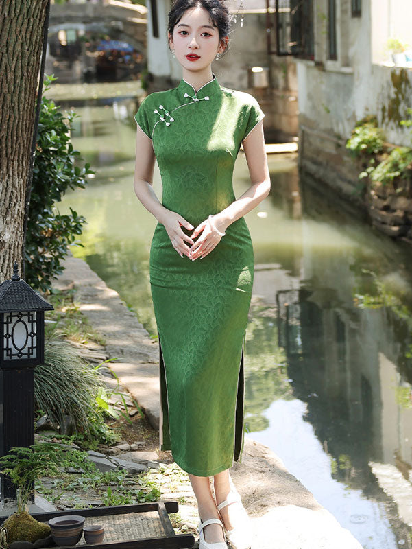 2024 Green Leaf Jacquard Qipao Cheongsam Dress