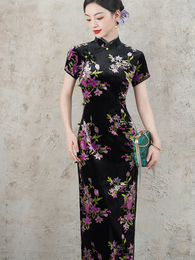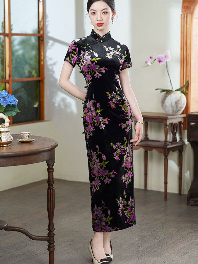 Floral Print Velvet Mothers Winter Cheongsam Qipao Dress