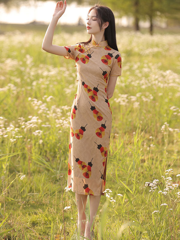 2021 Light Print Linen Cheongsam Qi Pao Dress