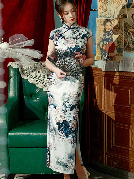 2022 Gray Floral Print Maxi Cheongsam Qi Pao Dress
