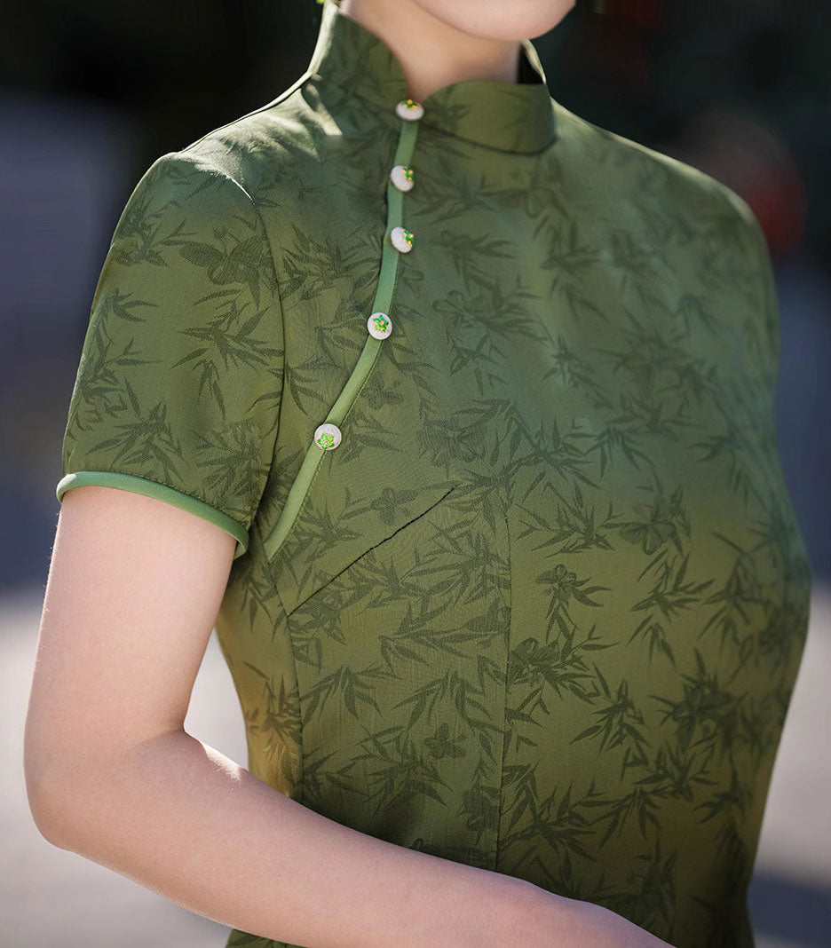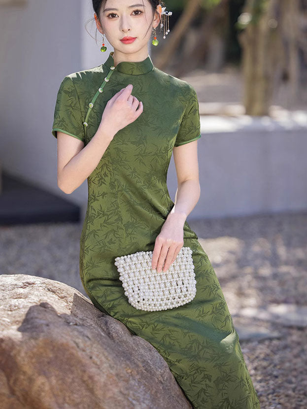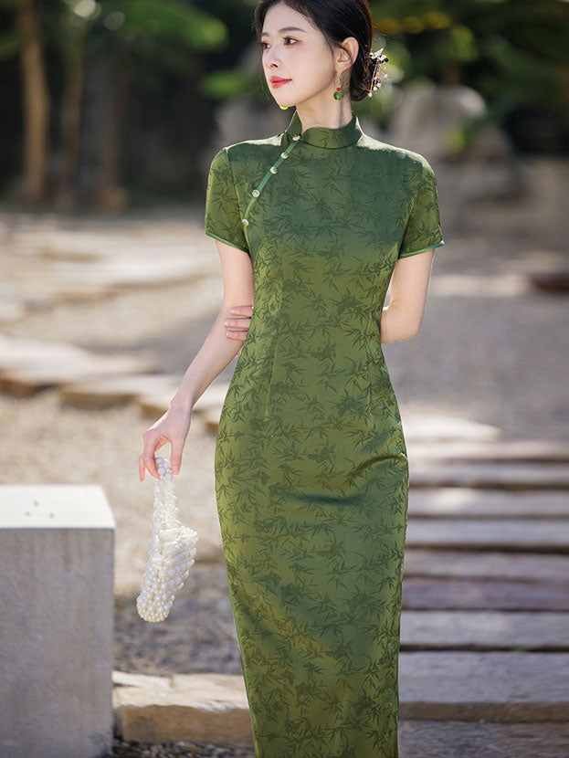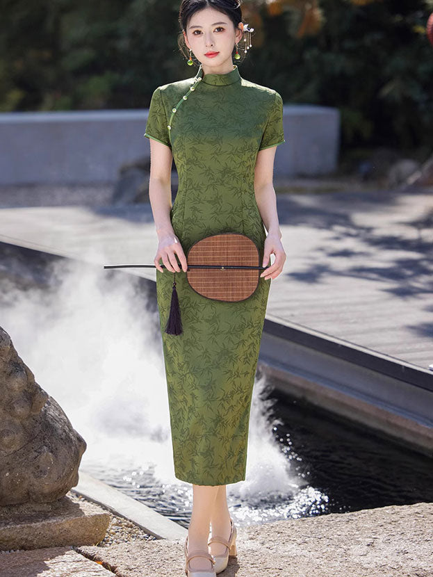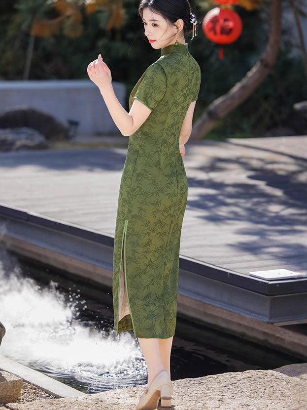 2025 Green Bamboo Print Cheongsam Qipao Dress