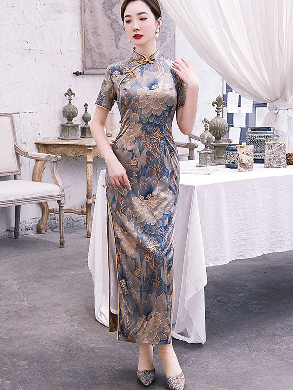 Blue Bronzing Floral Maxi Cheongsam Qi Pao Dress