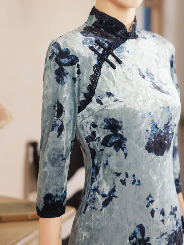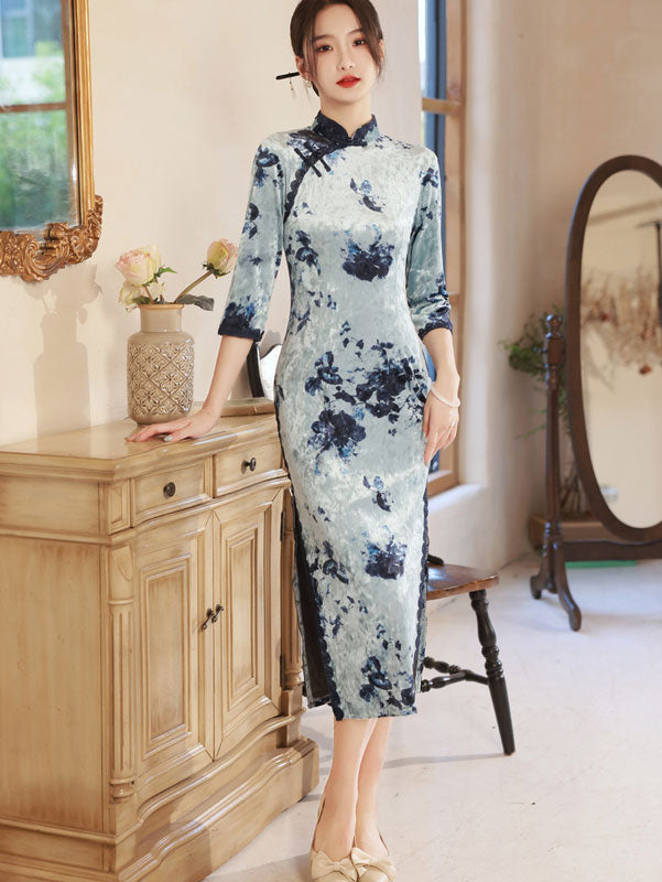 Blue Champagne Floral Velvet Cheongsam Qipao Dress