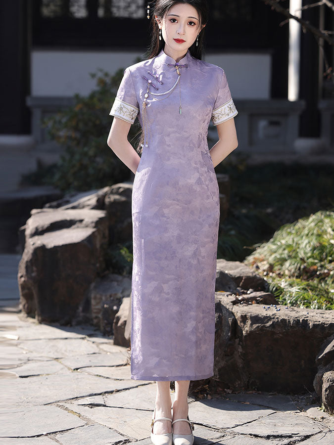Purple Jacquard Floral Cheongsam Qipao Dress