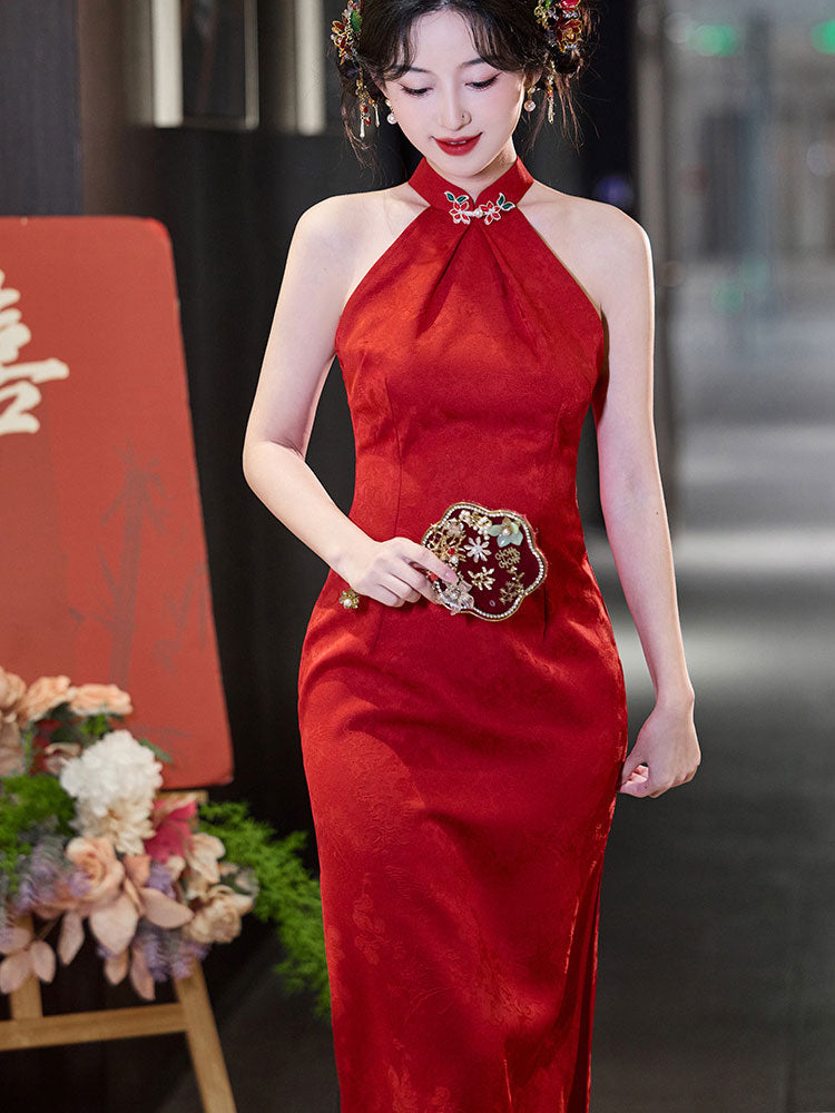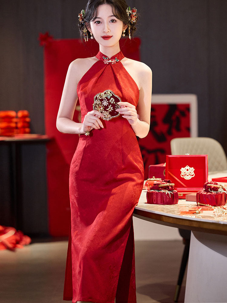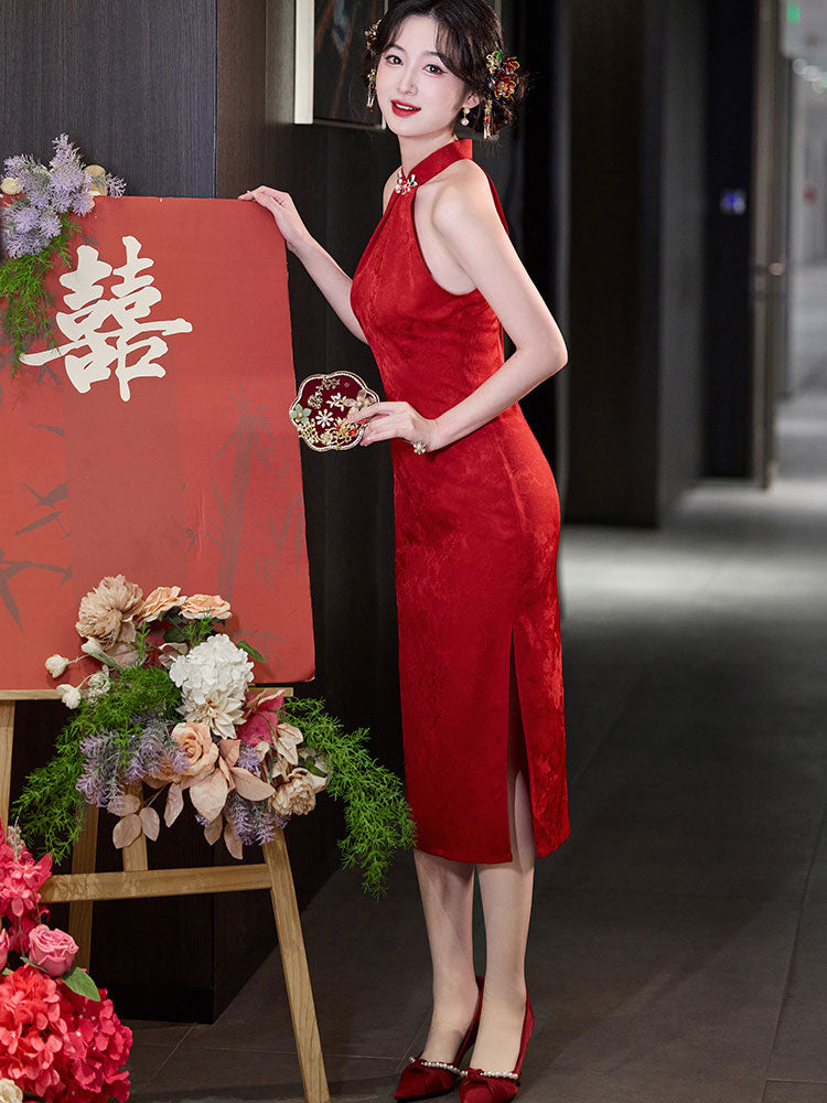 Red Jacquard Halter Midi Bridal Cheongsam Qipao Dress
