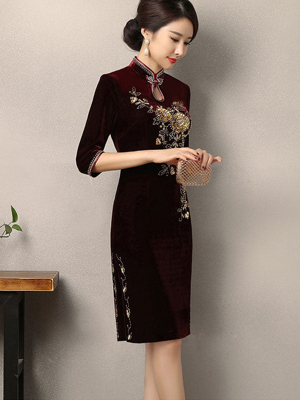 Mothers Velvet Mid Qi Pao Cheongsam Dress with Beaded Floral