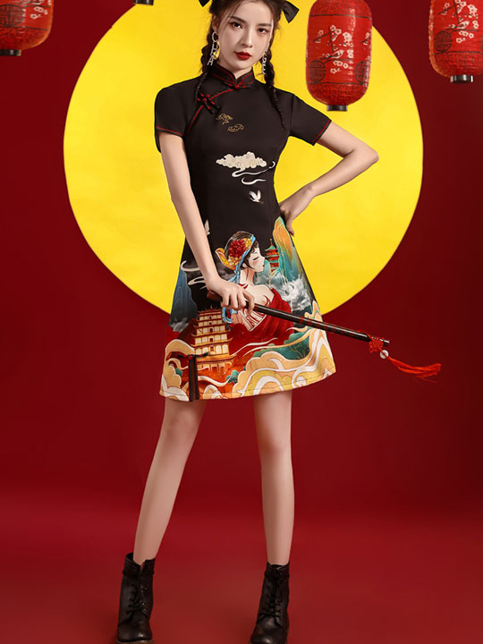 Summer Chinese Painting Print Mid Cheongsam Qipao Dress