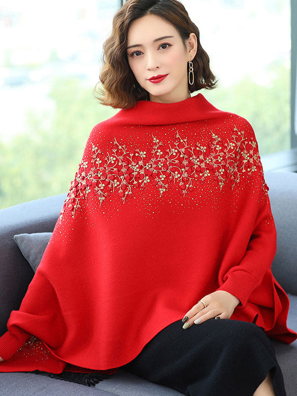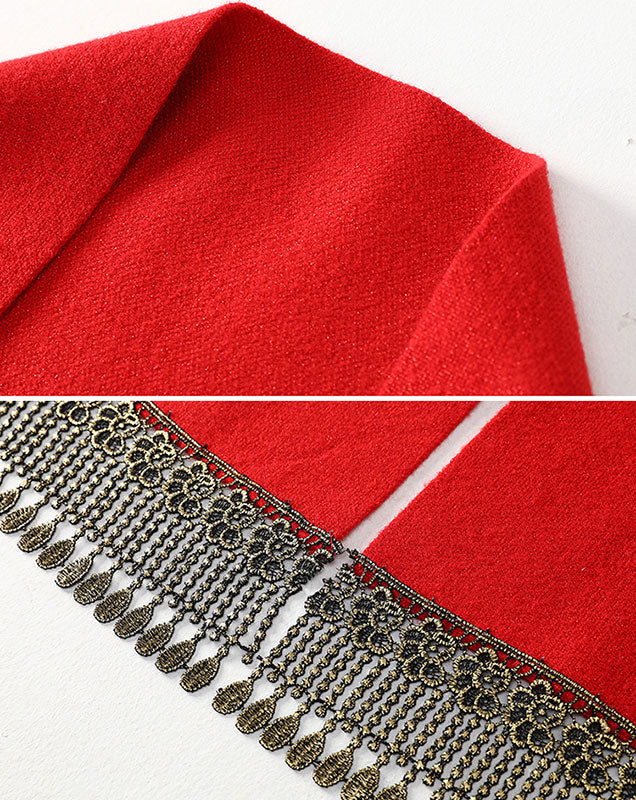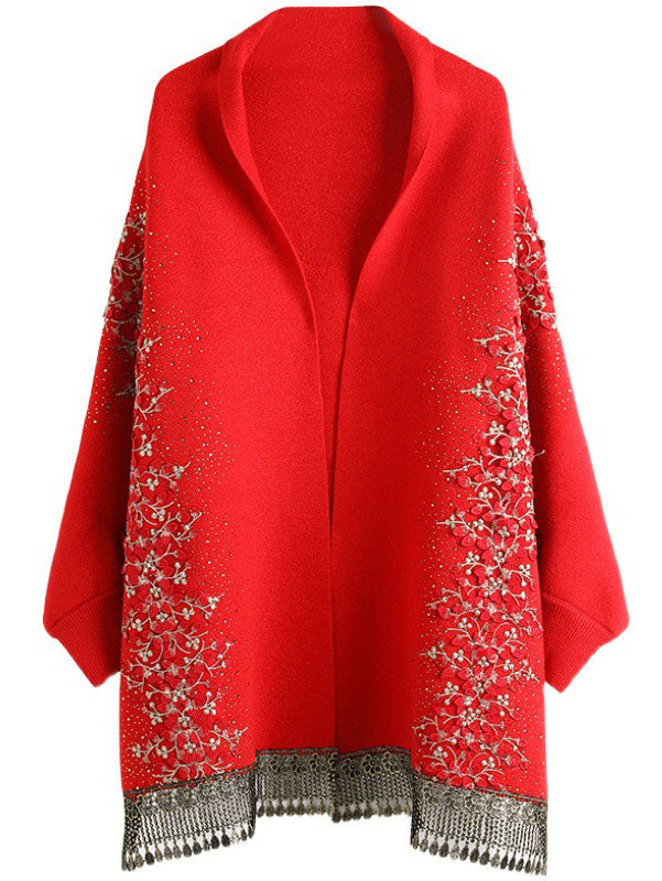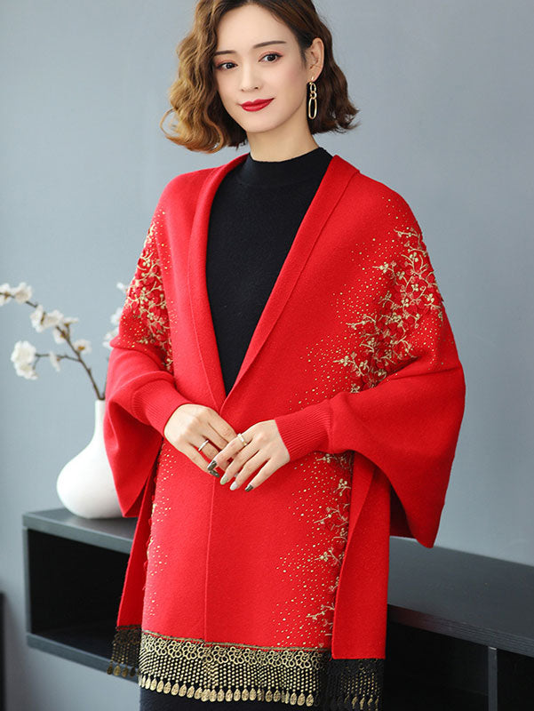 This shawl cape features tassels, long sleeve and floral lace trim.