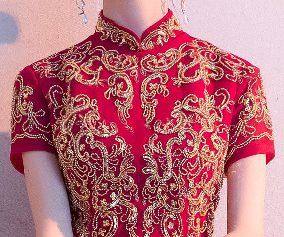 Gold Sequins Appliqués Wedding Bridal Qipao Cheongsam Dress