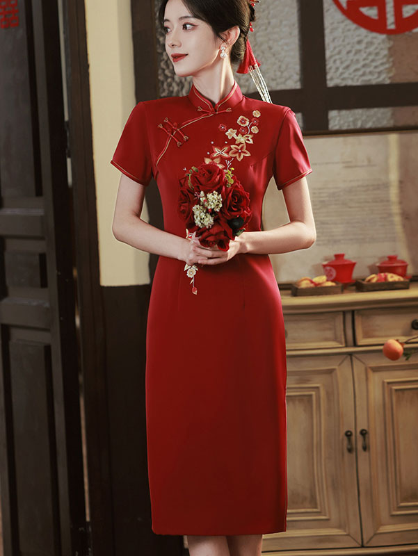 Red Embroidered Floral Mid Qipao Cheongsam Dress