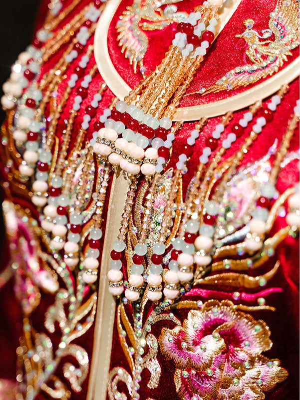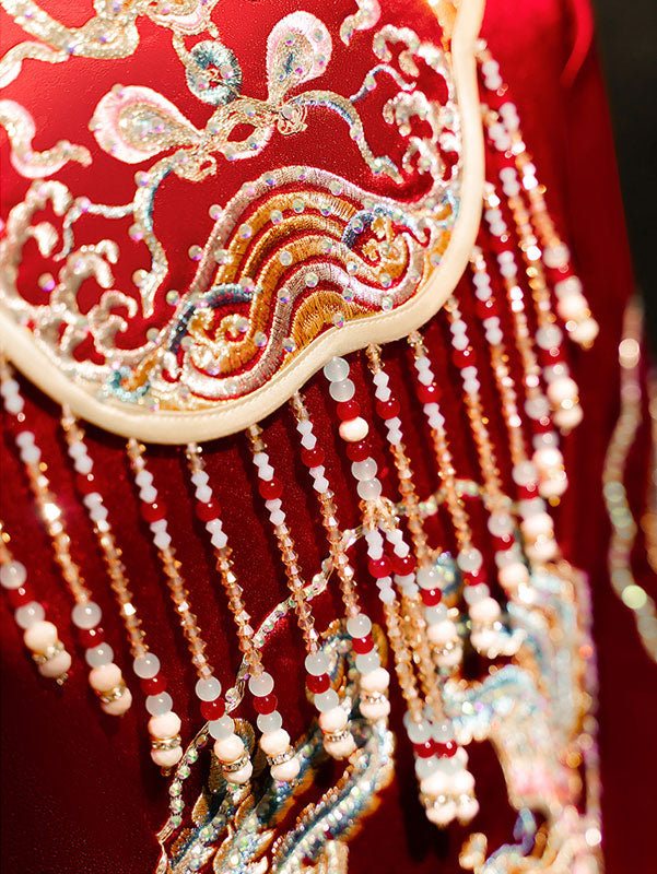 - Jacket: mandarin collar, zip closure, asymmetric sleeve, beads tassels
