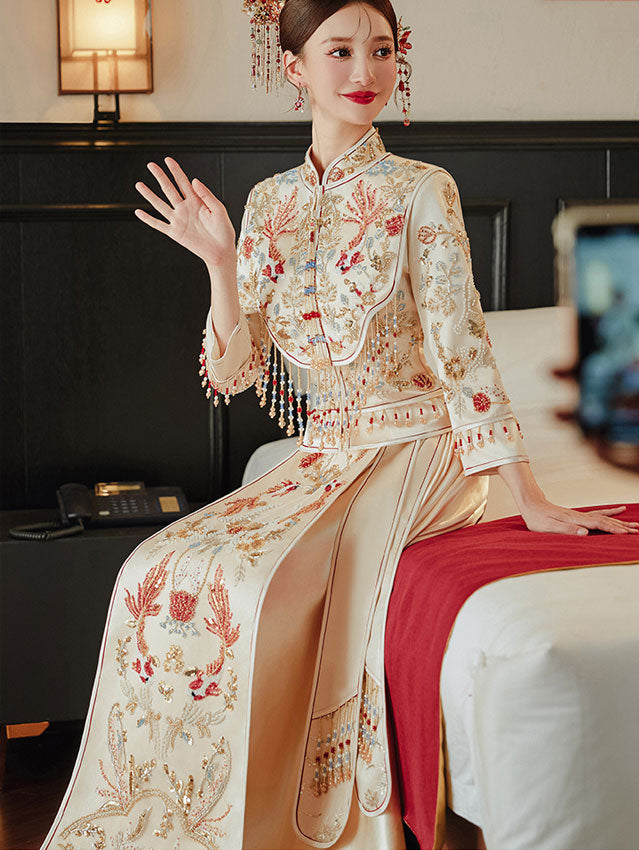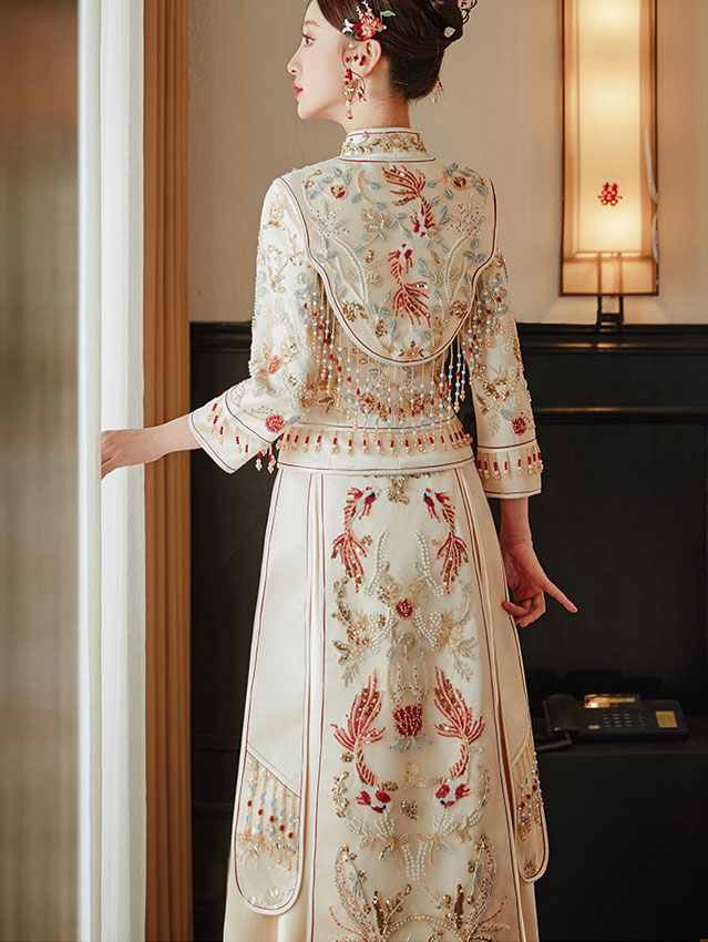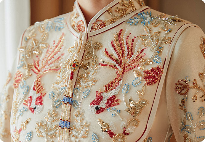 - Jacket: mandarin collar, zip closure, detachable shawl with beads tassels