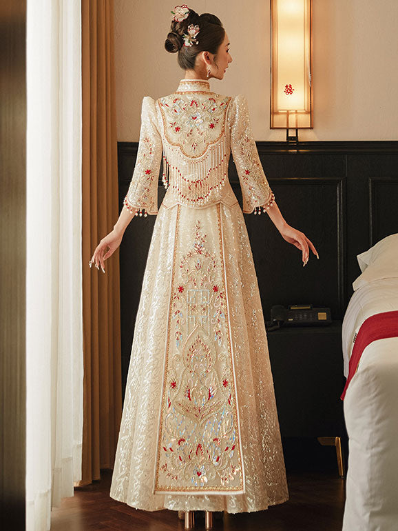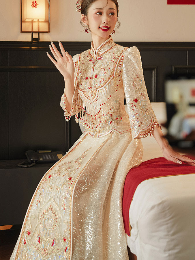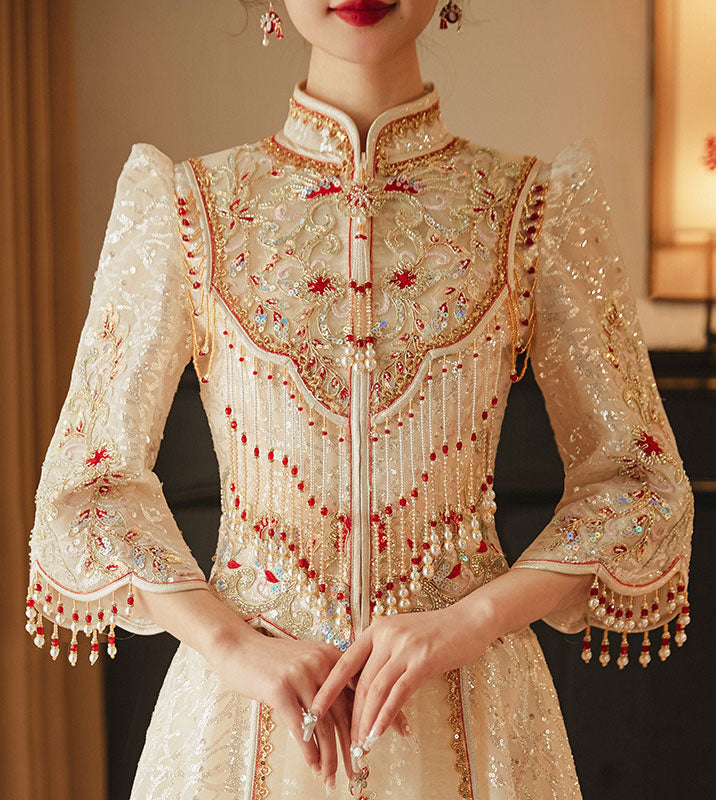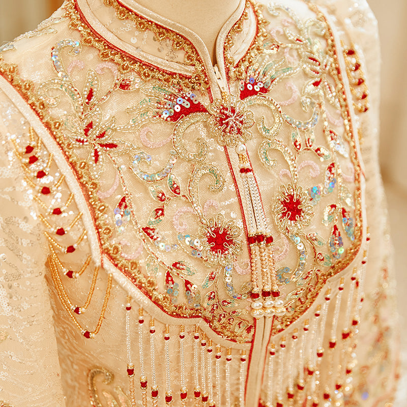 - Made of sequins and appliqués mesh, the qun gua includes a jacket and a skirt.