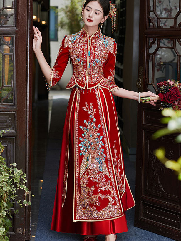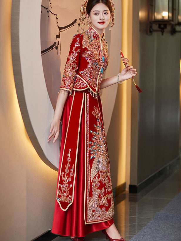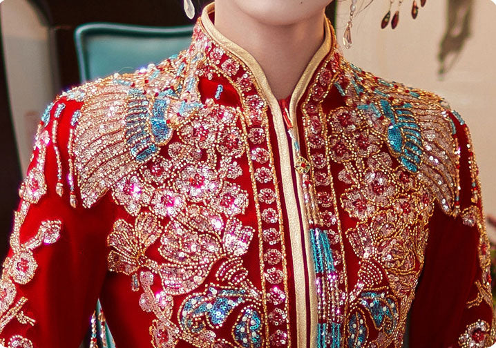 - Jacket: mandarin collar, beaded phoenix appliques, beads tassels