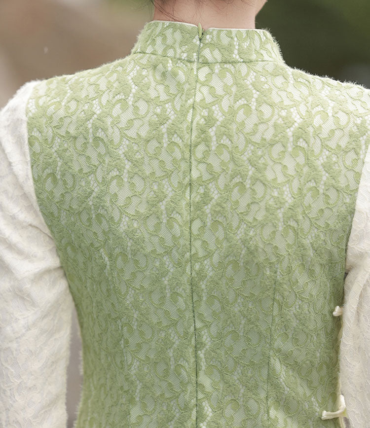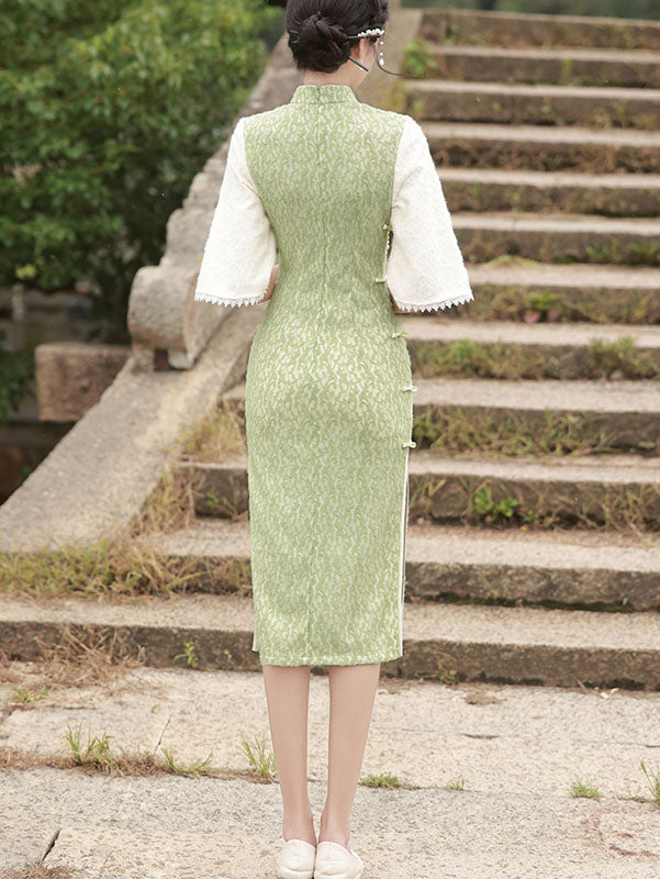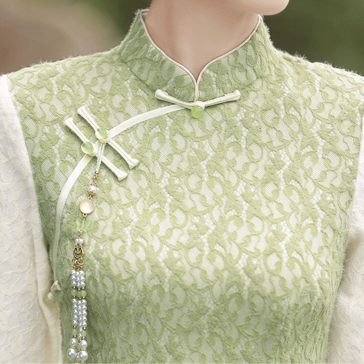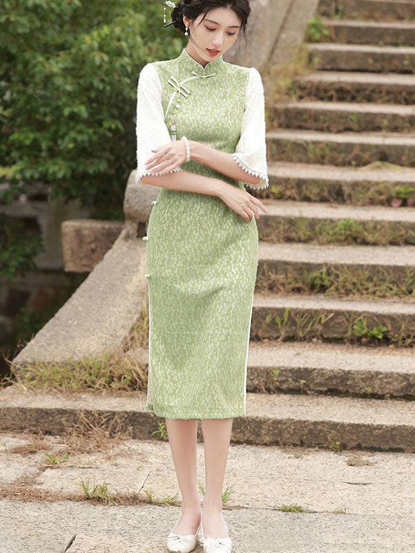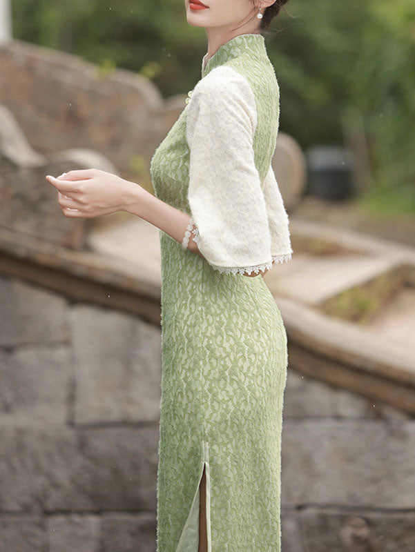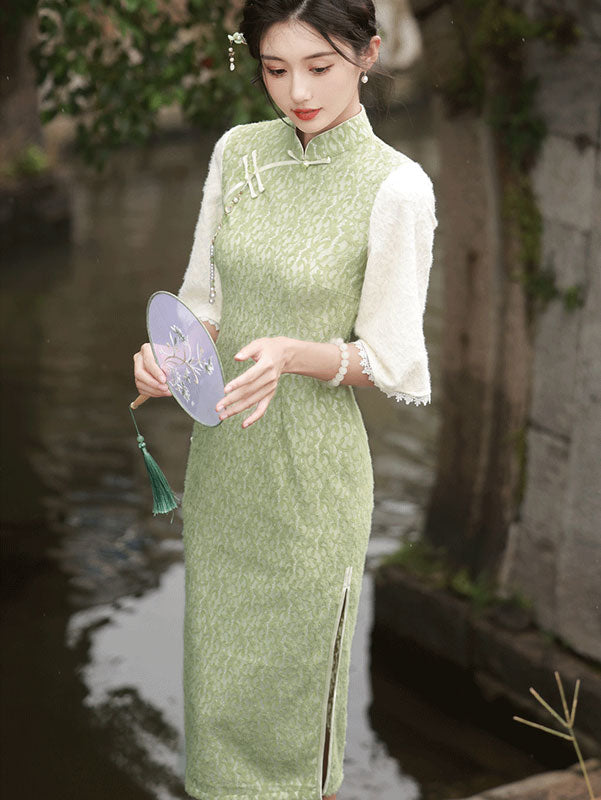 Green Lace Winter Midi Cheongsam Qipao Dress