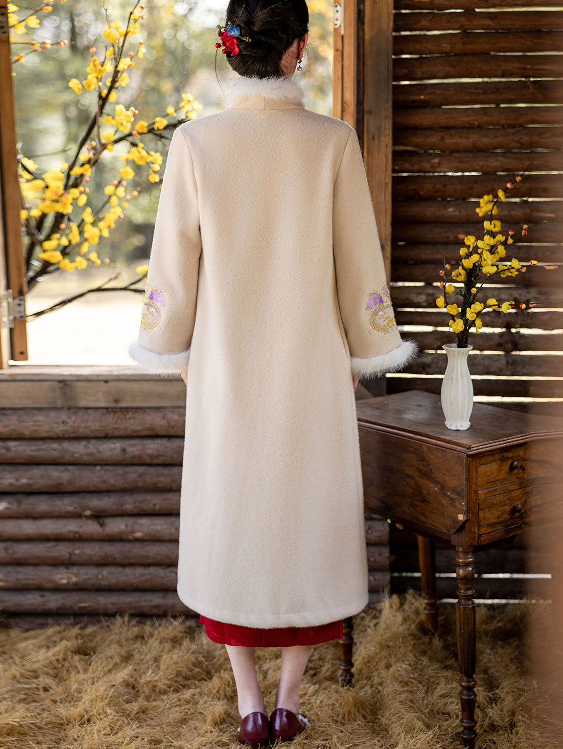 Winter wool poncho coat featuring faux fur trim, open front, dragon embroidery, loose fit silhouette.
