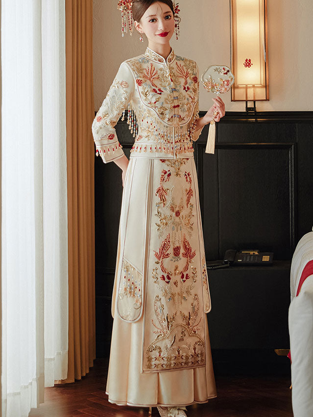 - Jacket: mandarin collar, zip closure, detachable shawl with beads tassels
