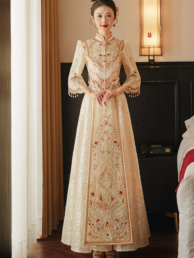 - Made of sequins and appliqués mesh, the qun gua includes a jacket and a skirt.