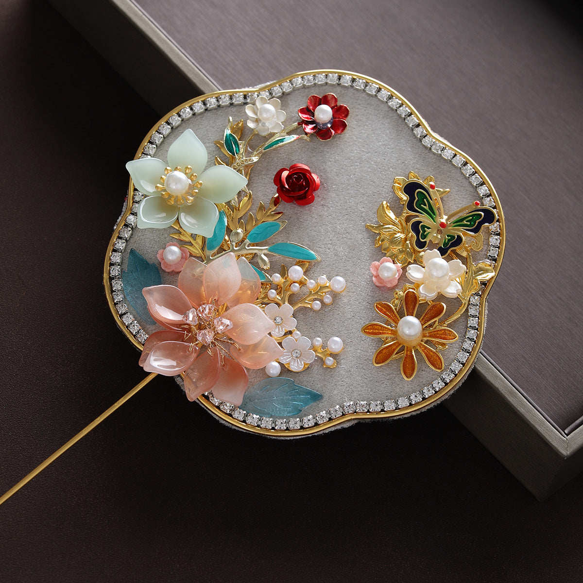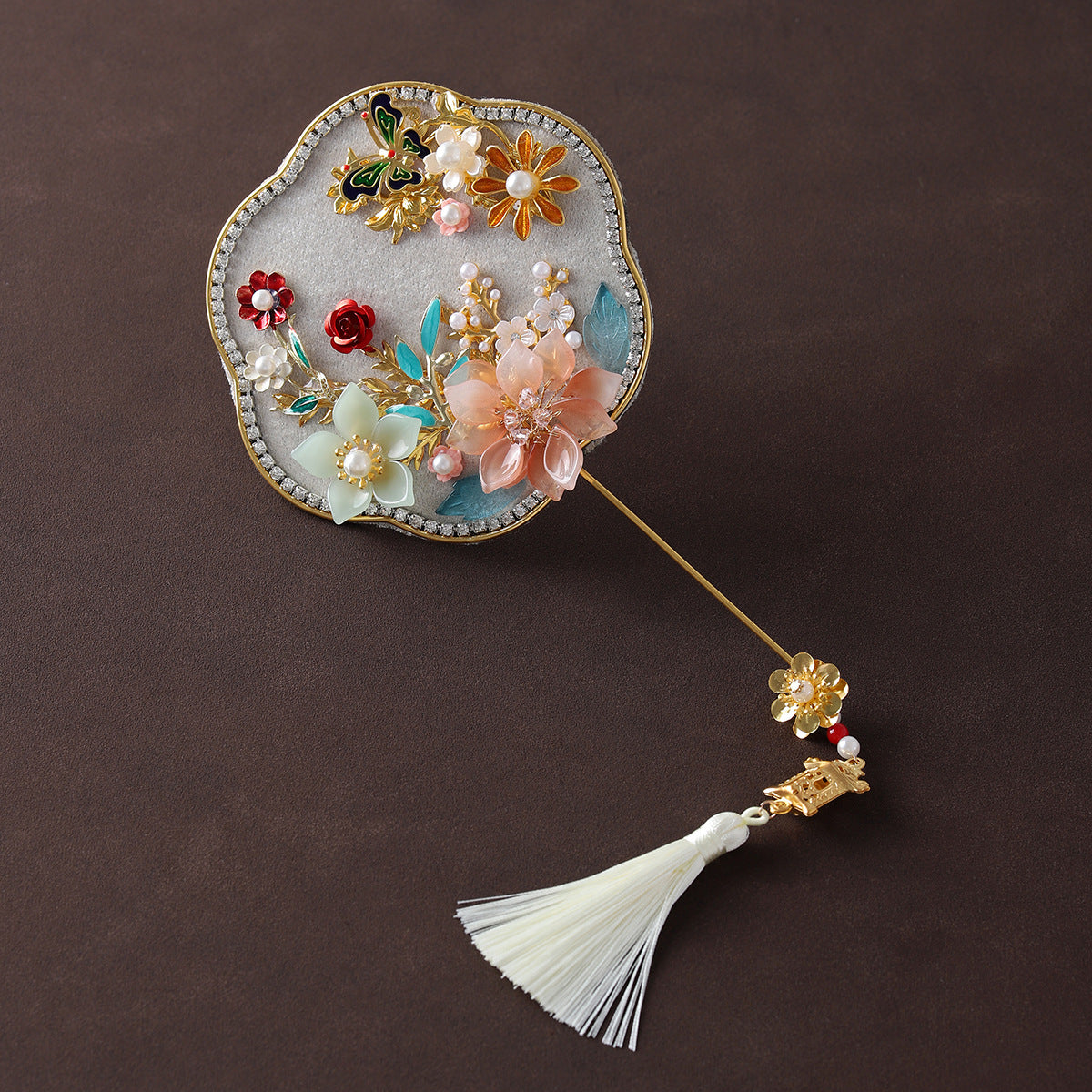 The translucent fan has delicate patterns, including leaves, butterflies and flowers.