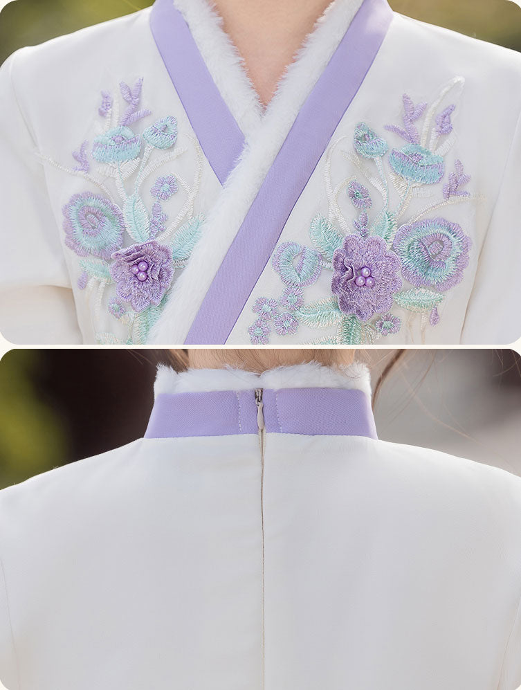 Fleeced lining is added the top of the hanfu dress to keep warm on the chilled days.