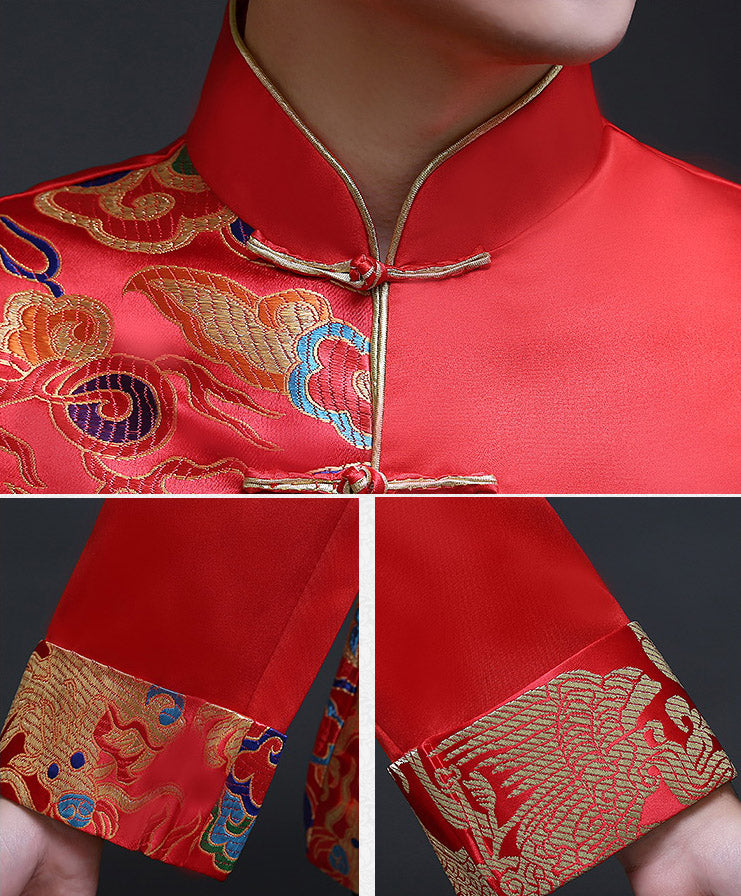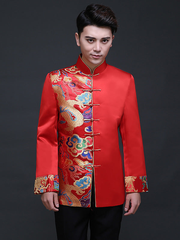 Red Traditional Chinese Men's Wedding Jacket with Woven Dragon