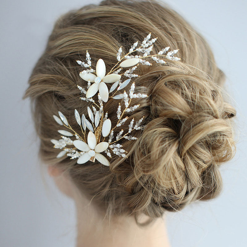 Wedding hair piece in unique design and excellent workmanship, made of rhinestone, crystals, shell petals and alloy.